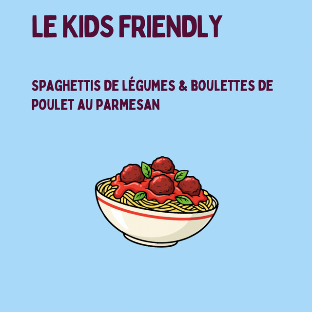 PLAT – Le Kids-Friendly / Spaghettis de légumes & boulettes de poulet au parmesan